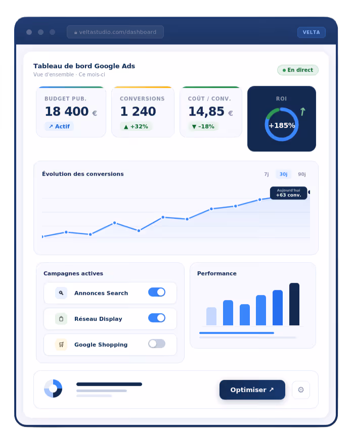 En 32 jours, 3 790 € de budget publicitaire ont généré plus de 43 000 € de valeur de conversion — à seulement 1,88 € par conversion. C'est le résultat d'une stratégie construite sur les bons mots-clés, un suivi rigoureux dès le départ, et une optimisation continue.